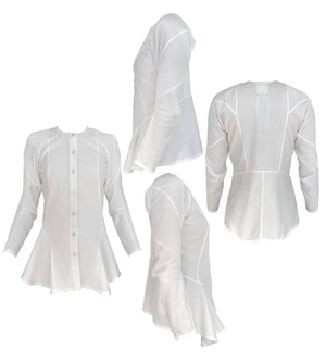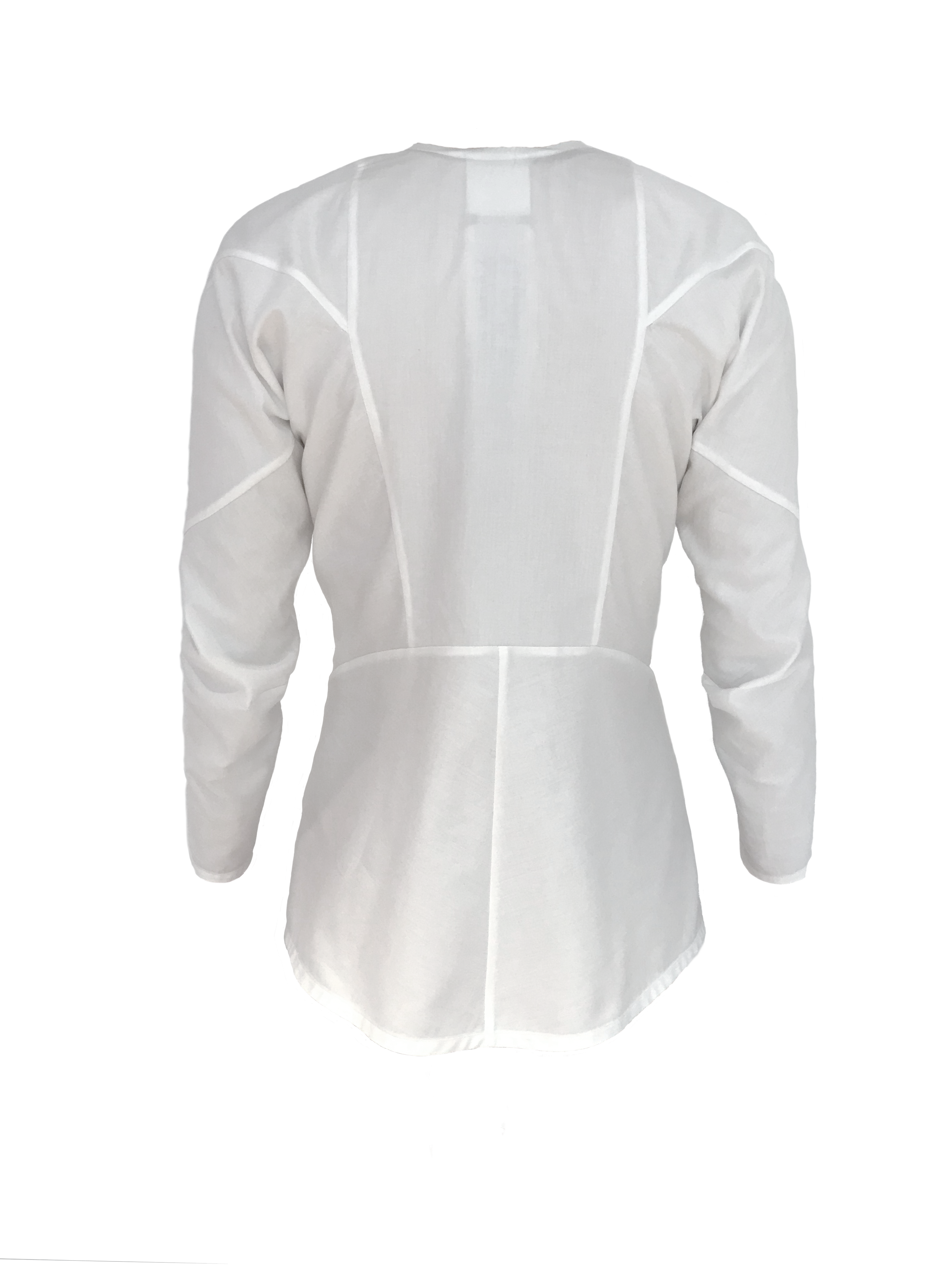 #pose 1 shirt is draped and constructed from a sitting down pose and has by design an unbalanced hemline. The shirt has long sleeves, a rounded neckline and is closed front side with a button placket. The shirt fits gently around the upper body with a loose godet-looking swirl on the lower part of the front body. All the seamlines are placed to convey an engineered shape for future expressive motion. Inside, all seams are carefully sewn with french seams and hems are covered with bias tapes in main fabric.