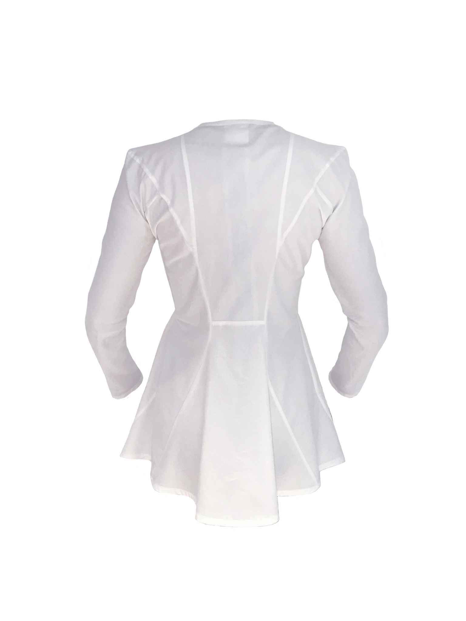 #pose 2 shirt is draped and constructed from a twisted standing pose and is by design the longest of the poses series. The shirt has long sleeves, a rounded neckline and is closed front side with a button placket. The shirt fits gently around the upper body with a focus on a strong shoulder. On the backside of the lower body, the fabric falls generously in folds. All the seamlines are placed to convey an engineered shape for future expressive motion. Inside, all seams are carefully sewn with french seams and hems are covered with bias tapes in main fabric.